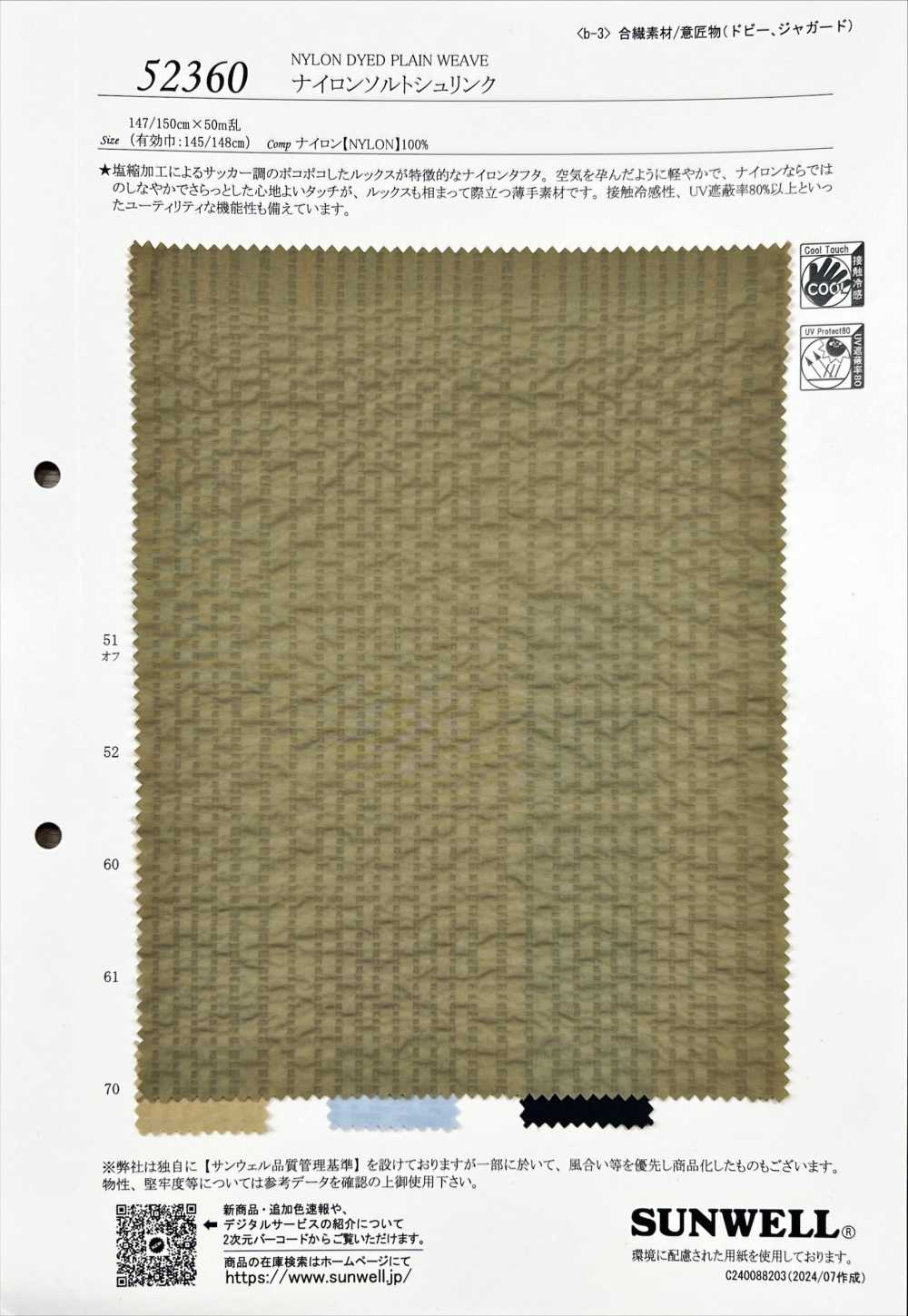 This textile has a cooling sensation to the touch and a UV blocking rate of over 80%, and also has a seersucker like appearance due to salt shrinkage processing.