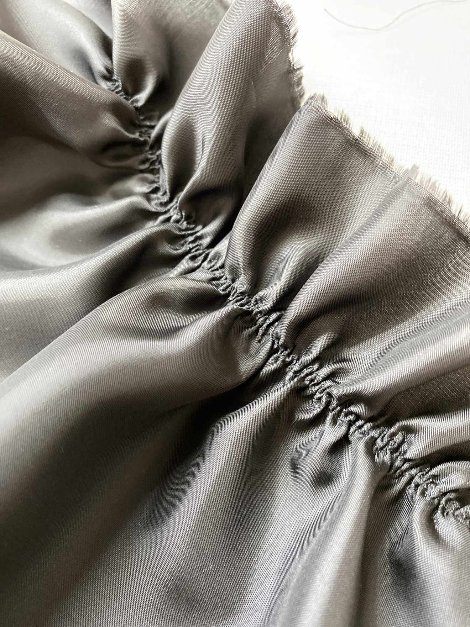 It is crisper and firmer than regular shirring elastic band, and has a non-fluffy texture. When the black color stretches, you can see some of the white core elastic band inside.